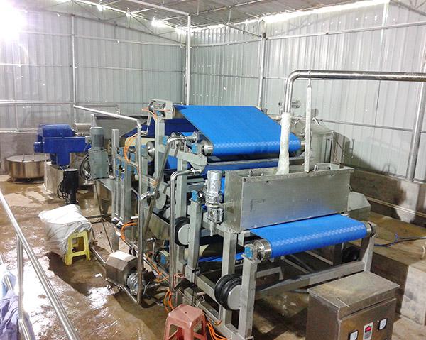 The refined wet slag raw materials (or solid-liquid mixture) are continuously entered into the hopper through screw pump or conveyor (the material occupies adjustable bandwidth). The two inner and outer ring filter belts are driven by the driving roller, and are distributed evenly by the screw pressing roller, and then enter the curved wedge-shaped area for initial pressure dehydration, and then enter the low pressure zone. A pressure roller with "L" type strip will water Press out a lot of parts, and ensure that the water is discharged from both sides, then enter the high pressure zone of the clamping extrusion. The inner and outer filter belts bypass several groups of reducing diameter of the pinch extrusion roller. A large amount of water is pressed out slowly and forcefully to form the pressed filter cake. On the other hand, the filter belt is a shear force of "s" winding to produce the surface pressure of shaving increase. Under the tension of the filter belt, the outer filter belt will produce pressure on the material The small amount of water in the material is squeezed out. Because the diameter of the press roller decreases gradually, the pressure on the material between the filter belts increases gradually, and a small amount of water is continuously discharged. A large amount of water in the material is forced to squeeze and press the pinch roller and then collected and discharged through the connecting tank. After the inner and outer filter belts are separated, a wear-resistant scraper is provided to scrape the dehydrated filter cake (fruit residue) on the working surface of the inner and outer filter belt. Then, the high pressure solid cone-shaped convex cleaning nozzle forms a fan-shaped cross water belt to continuously wash the net belt to maintain the continuous dehydration effect.